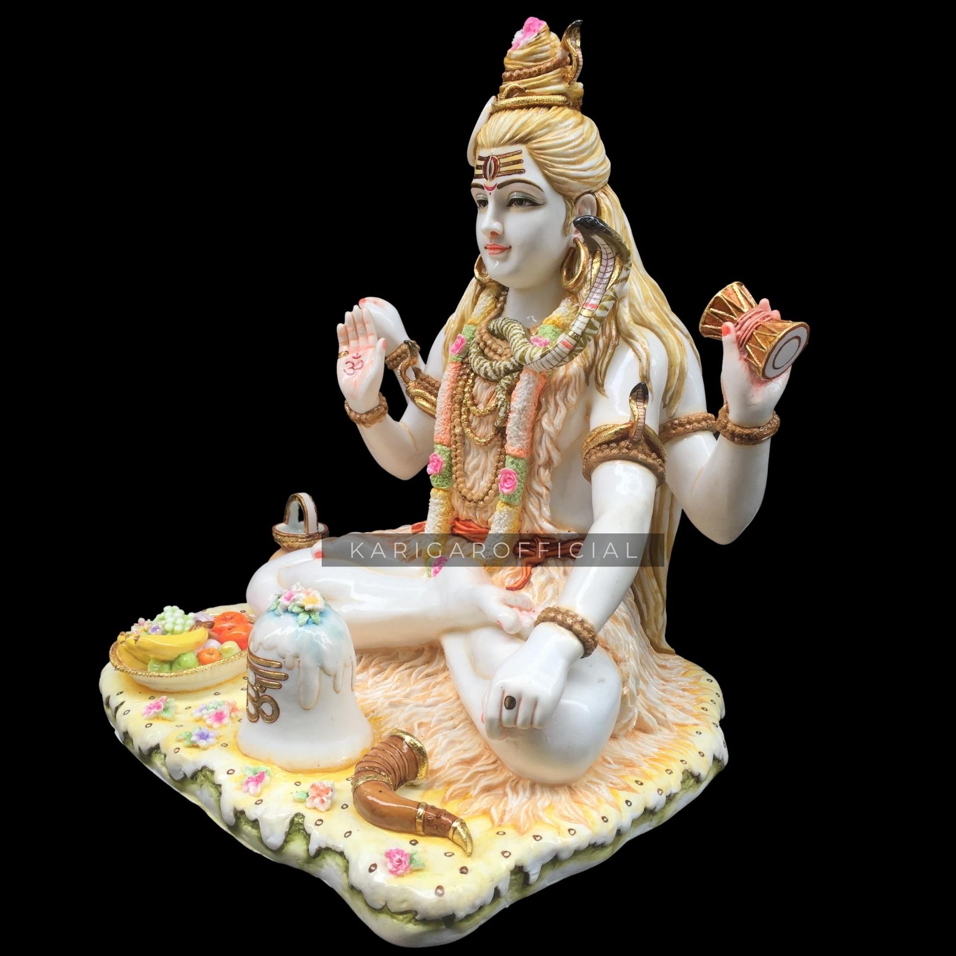 - Shiva or Mahadev is happily seated on a Kailash Parvat ( Kailash Mountain ) base with shiv ling in front of him, Fruit basket and Kamandal Kalash by his side.