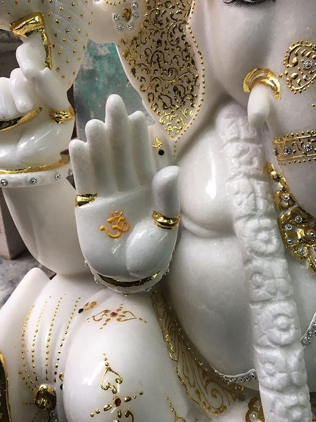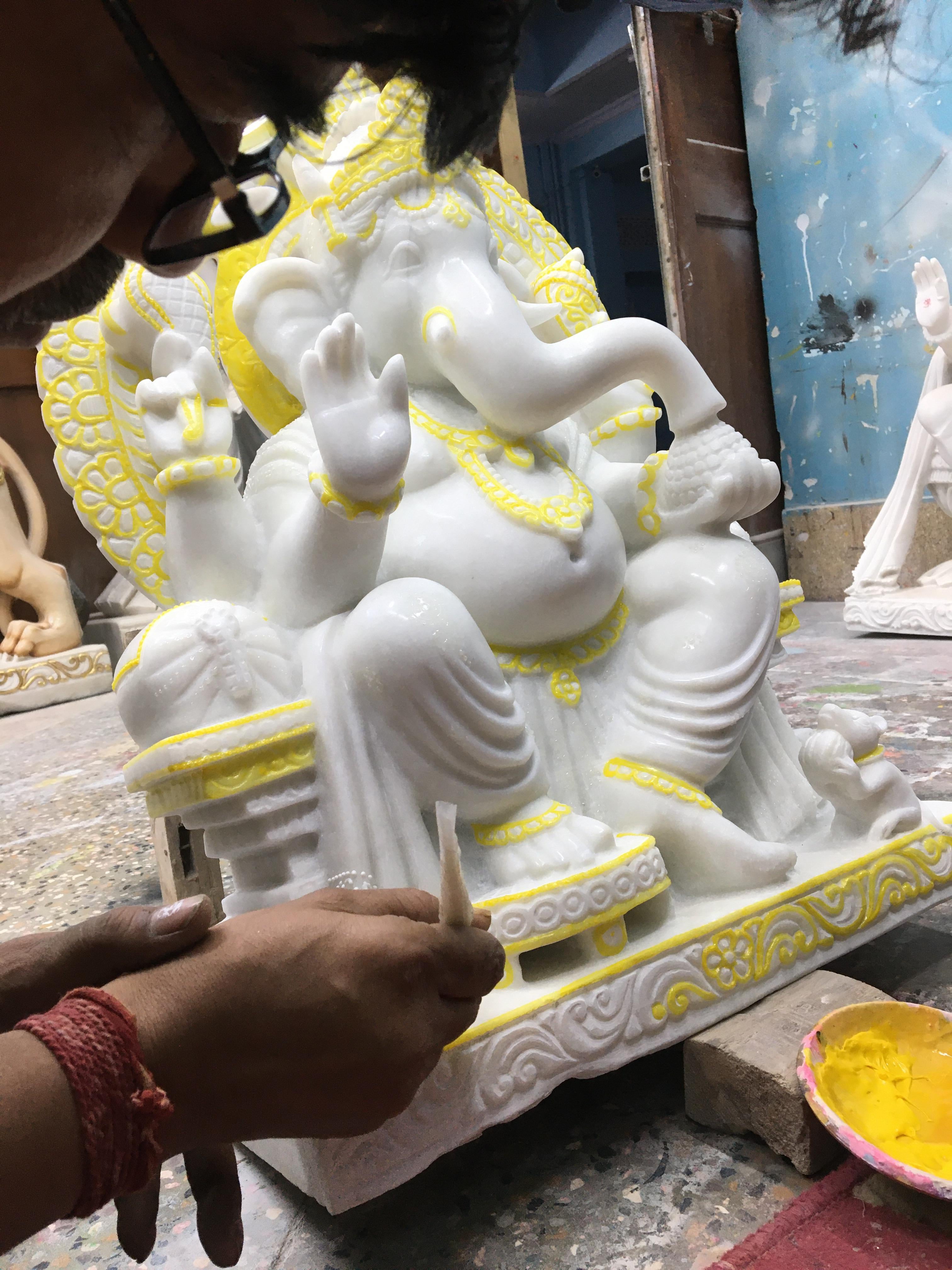 Hand painting a marble statue is a true art form. This detailed process transforms plain white marble into vibrant creations based on customer preferences. It includes applying gold leaf for a royal touch and using custom color combinations. We also offer stone-studded jewelry detailing, adding elegance and personalization to every piece.